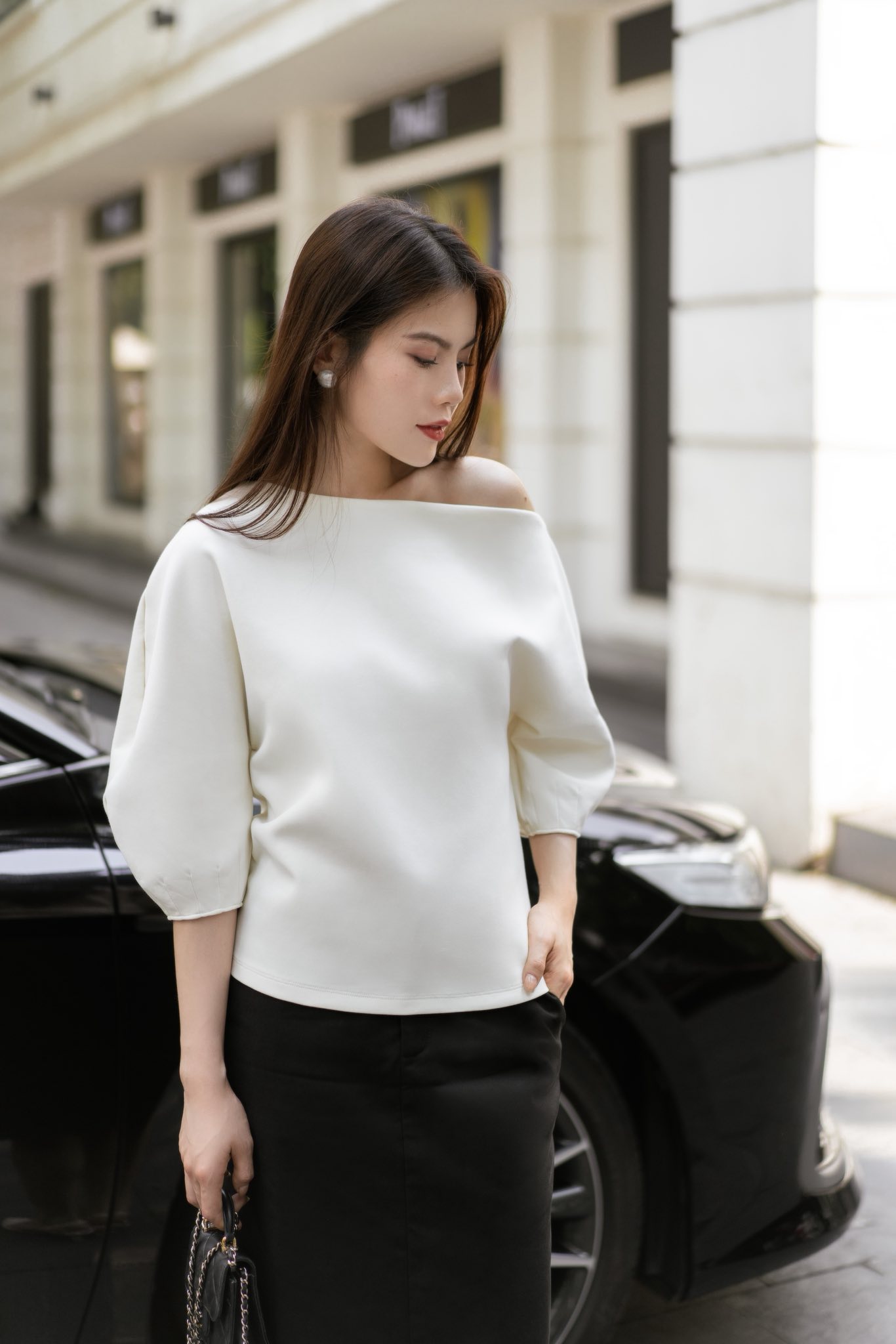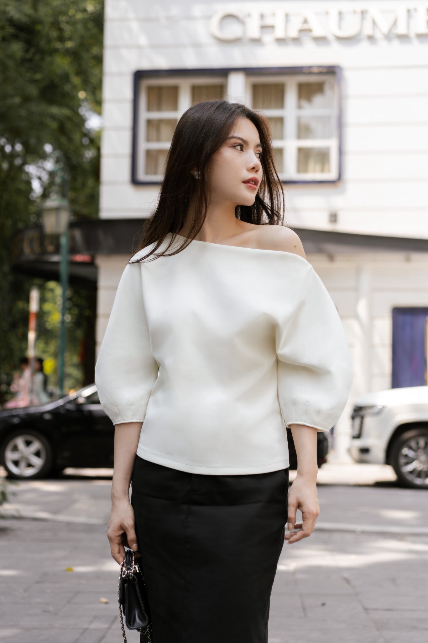 • Hở vai nhẹ nhàng, tôn bờ vai & xương quai xanh tinh tế