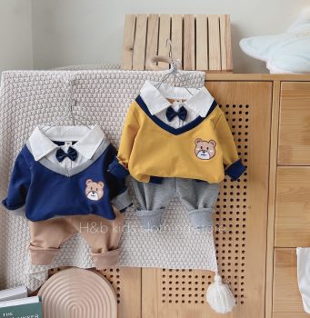 Bộ nỉ da cá phối cổ sơ mi nơ cho bé, phong cách công tử hàn xẻng khỏi phải bàn luôn