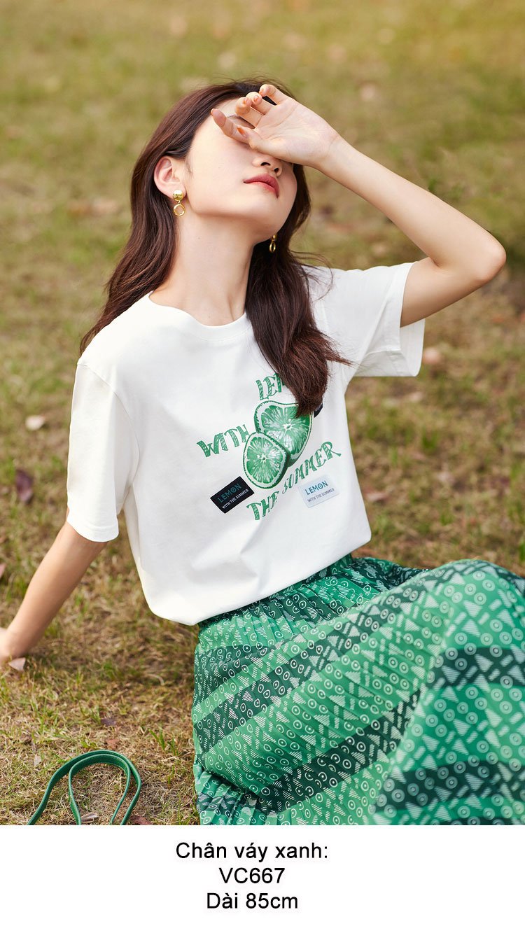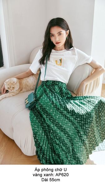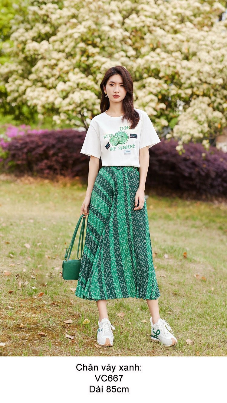 Chân váy xanh lá họa tiết chữ Eifini cho nàng thắm sắc mùa hè nhé. Go green và làm mát lịm tim người với tông màu xanh biếc, váy xếp ly nhỏ rất dầy, tông xanh nhưng là có những mảng sóng xanh đậm và xanh nhạt uốn lượn mềm mại đi chéo từ hông trái xuống chân phải, lại thêm họa tiết nhỏ hình tròn và vạch chéo hình tam giác màu trắng rải kín bề mặt, nên mỗi bước chân đi cảm giác như sóng triều xô đẩy tạo nên những làn sóng xanh lá lăn tăn bọt. Đặc biêtj là Alicia còn có áo phông có họa tiết màu xanh cùng tông để phối làm cặp đôi hoàn hảo với váy nhé. Các nàng thích nghiêm chỉnh thì cứ phối kèm sơ mi trắng là tha thướt lượn đi làm hay đi biển đều đc nhé.