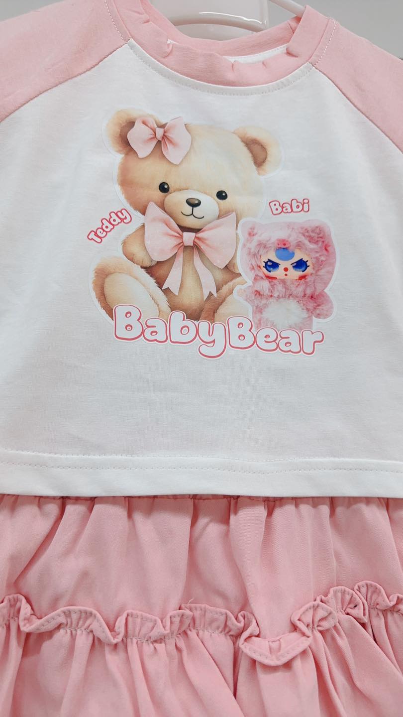 Set bộ gồm áo cotton trắng phối tay hồng, hoạ tiết gấu dễ thương; chân váy thô mềm nhún bèo điệu đà kèm quần đùi phía trong tiện lợi cho bé.