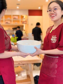 Hai người chụm lại bưng vừa cái tô