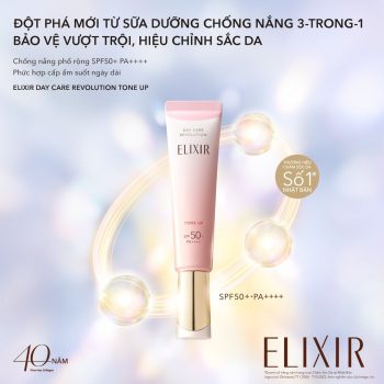 ELIXIR ra mắt sữa chống nắng SPF50+ PA++++ 3-trong-1 mới giúp chống nắng tối ưu, hiệu chỉnh sắc da tức thì, đồng thời bổ sung phức hợp cấp ẩm tăng sinh collagen cho làn da đều màu, rạng rỡ và căng mướt suốt ngày dài.