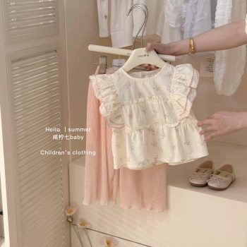 Áo thô thiết kế hoa xinh tay chạy bèo chỉ hồng, quần rập ly có quần lót bảo hộ
