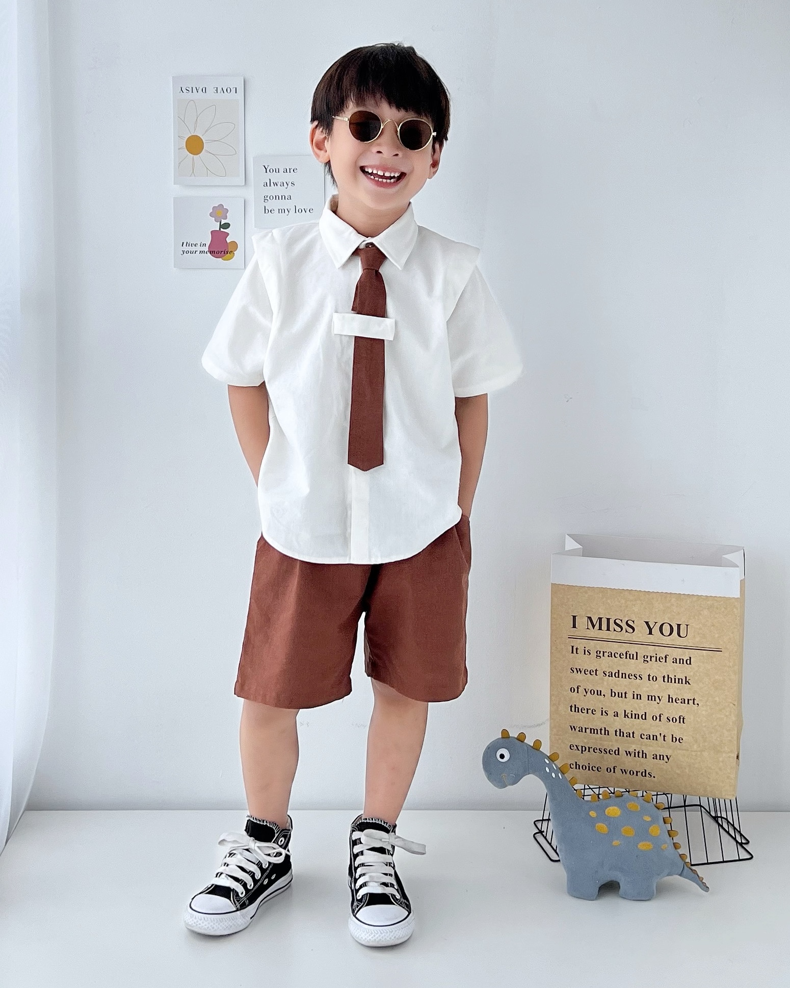 – Tone màu trắng nâu basic và cam đen nổi bật, bé diện đi học, đi chơi hay dự tiệc đều bảnh trai