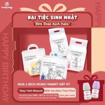 🍼 Từ 25/6 – 15/7, mẹ mua 4 bịch bỉm Momo Rabbit bất kỳ (không phân biệt size hay loại) sẽ được tặng ngay 1 bình Moyuum With Cat 170ml (giao ngẫu nhiên màu tím hoặc xám, có kèm núm ti số 1 nha mẹ).