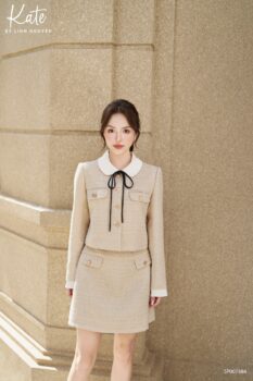 Xu hướng Rebel Chic thể hiện qua sự kết hợp giữa áo coat ngắn trẻ trung, cổ phối sơ mi hiện đại cùng chi tiết nơ thắt trendy, khuy trai tạo nên điểm nhấn vừa đủ, và chân váy dáng A, vừa năng động, vừa tăng thêm phần nữ tính cho tổng thể trang phục.