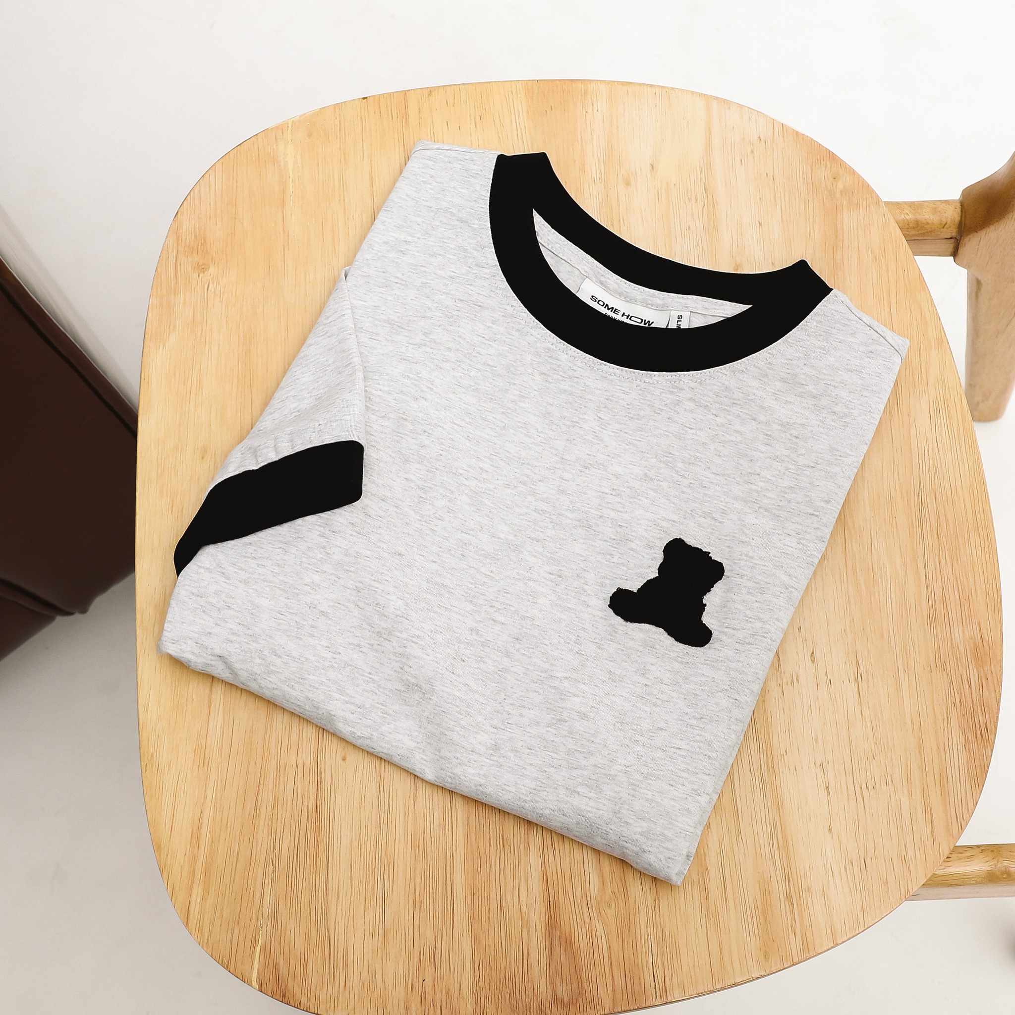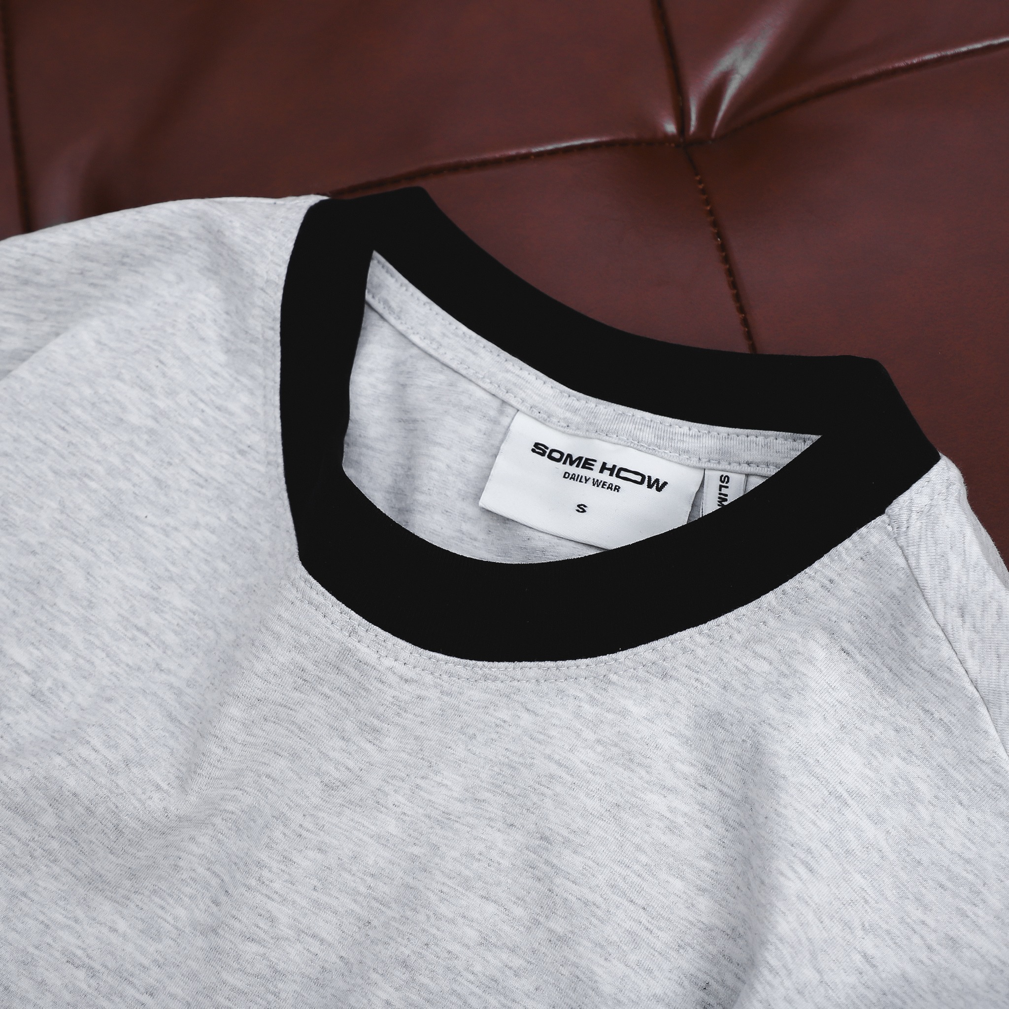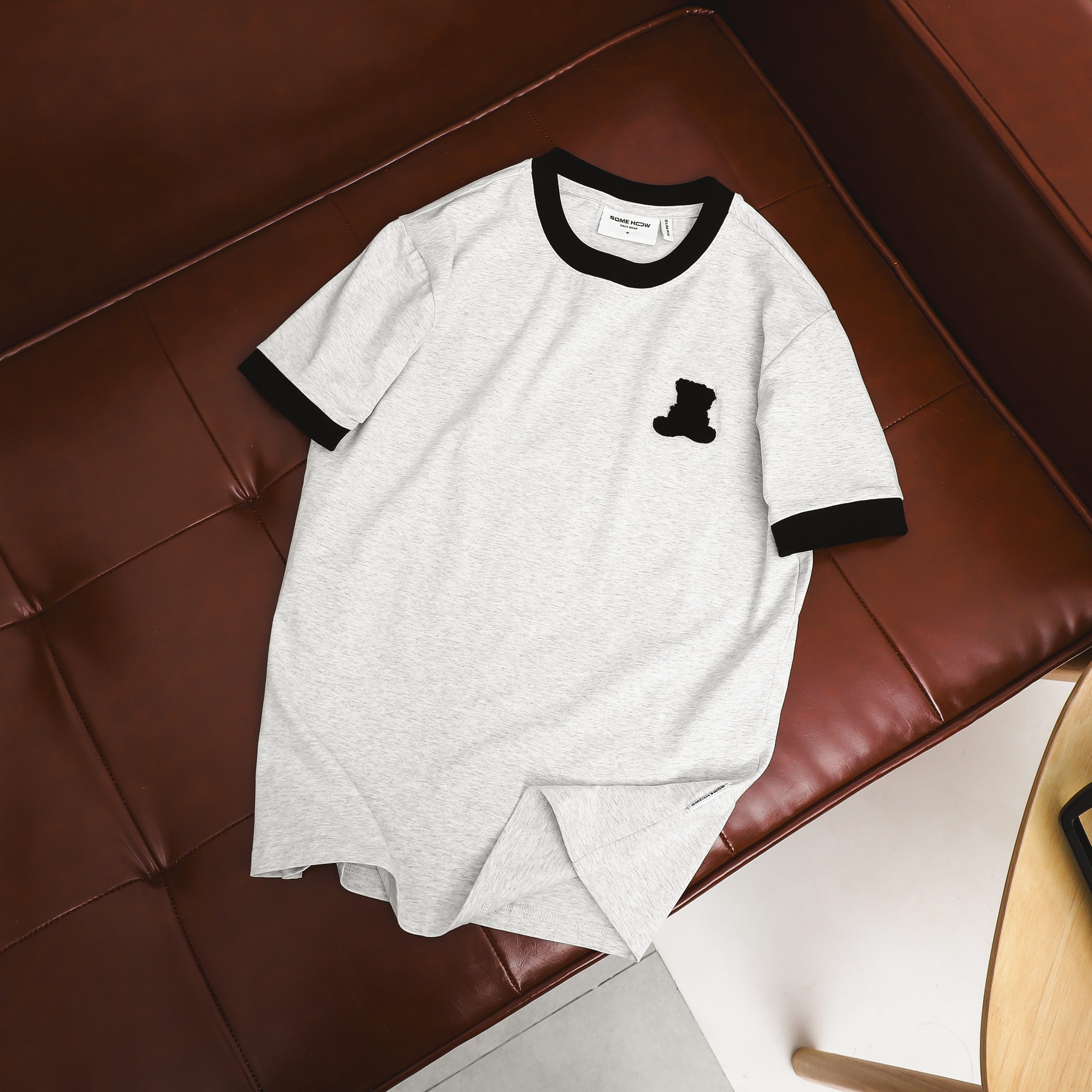 Áo thun với thiết kế form slimfit ôm nhẹ, tôn dáng, kết hợp chi tiết bo viền cổ và tay màu đen tạo sự tương phản nổi bật trên nền vải xám trung tính.