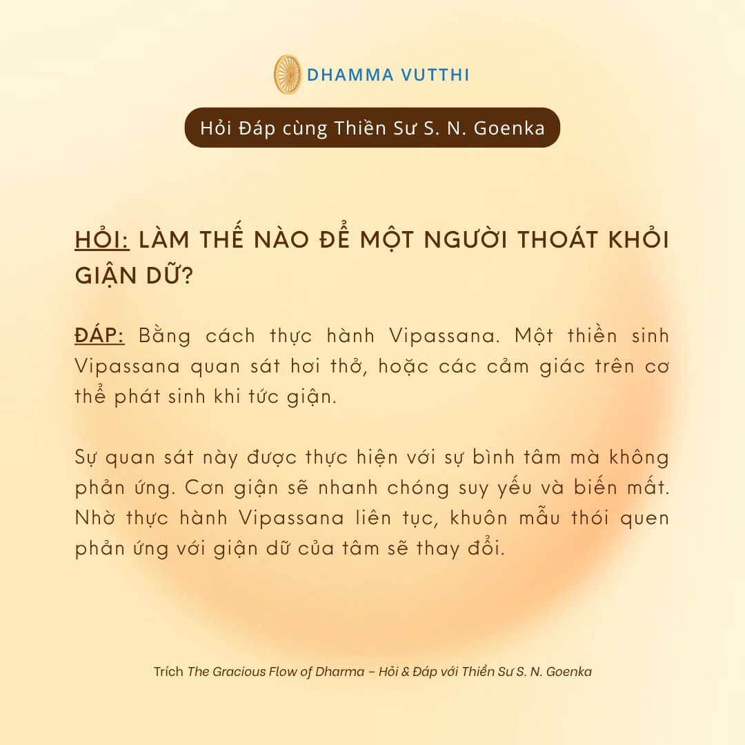 Đáp: Đây là điều mà Vipassana sẽ dạy cho con. Quan sát cơn giận, và con sẽ thoát khỏi nó. Và để quan sát cơn giận, con học cách quan sát hơi thở và cách quan sát các cảm giác của mình.