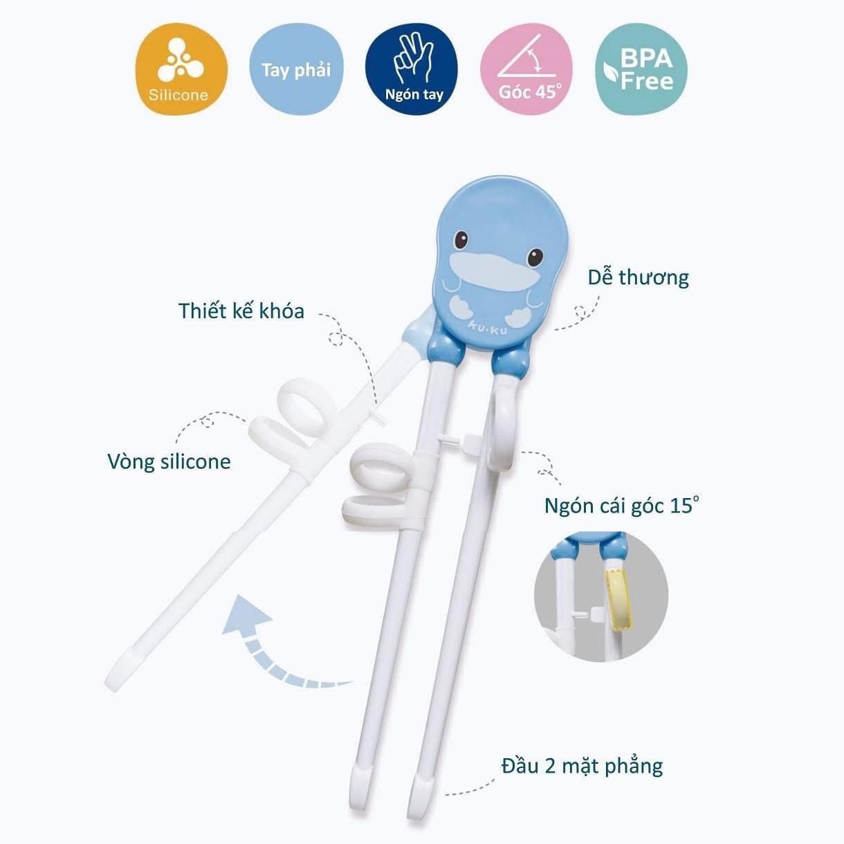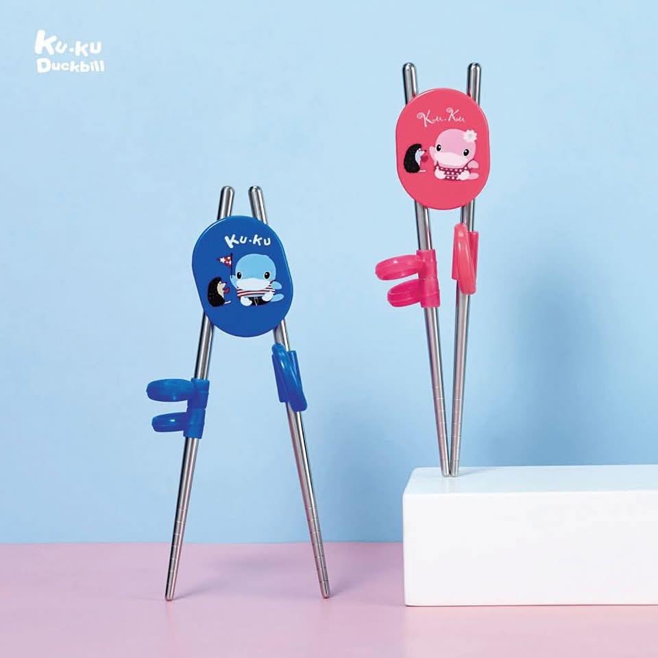 ✅ Đũa thiết kế in hình chú vịt KuKu đáng yêu và 2 màu sắc xanh/hồng dễ thương kích thích thị giác, bé thích hơn khi sử dụng.