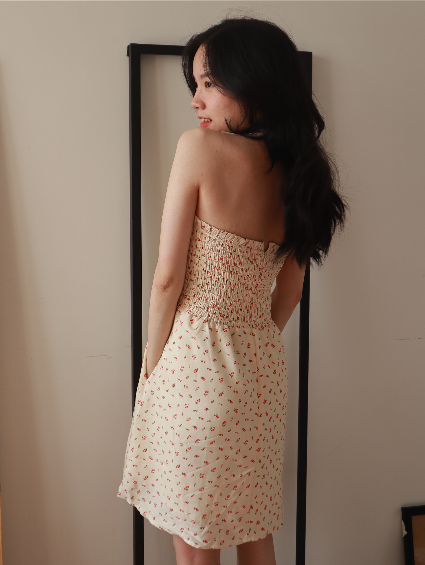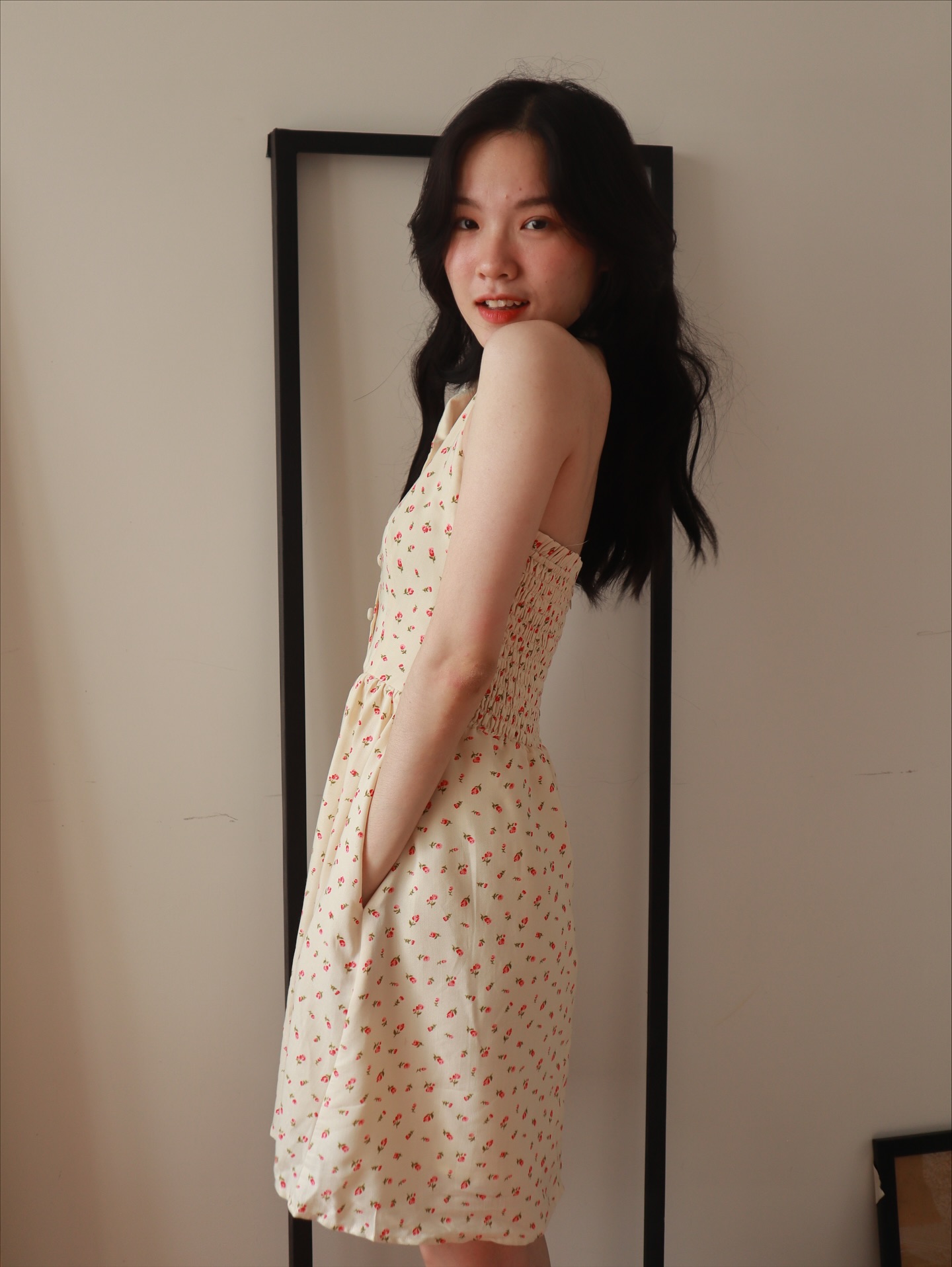 Đầm cũng đc may hai lớp, có hai túi hông tiện lợi ✨ Trước ngực đính hàng cúc giả, phía sau chạy dây kéo, giúp thao tác mặc gọn ơ.
