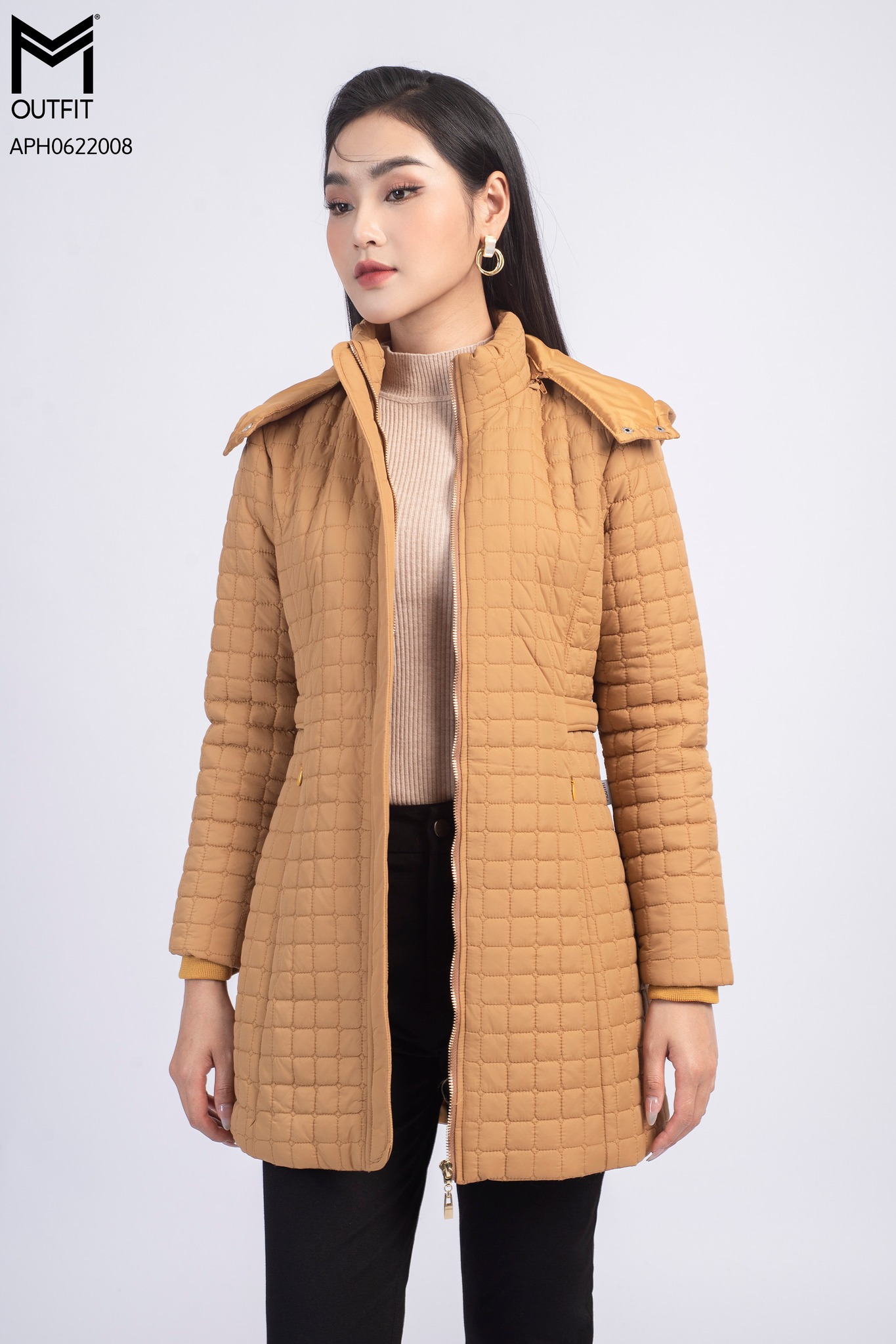 🔸 Phối đồ thời thượng: Khoác áo phao dáng dài bên ngoài một chiếc áo len ấm áp, một chân váy ngắn kèm bốt cao cổ, kéo khóa hờ để lộ lớp phối bên trong cực cuốn hút.