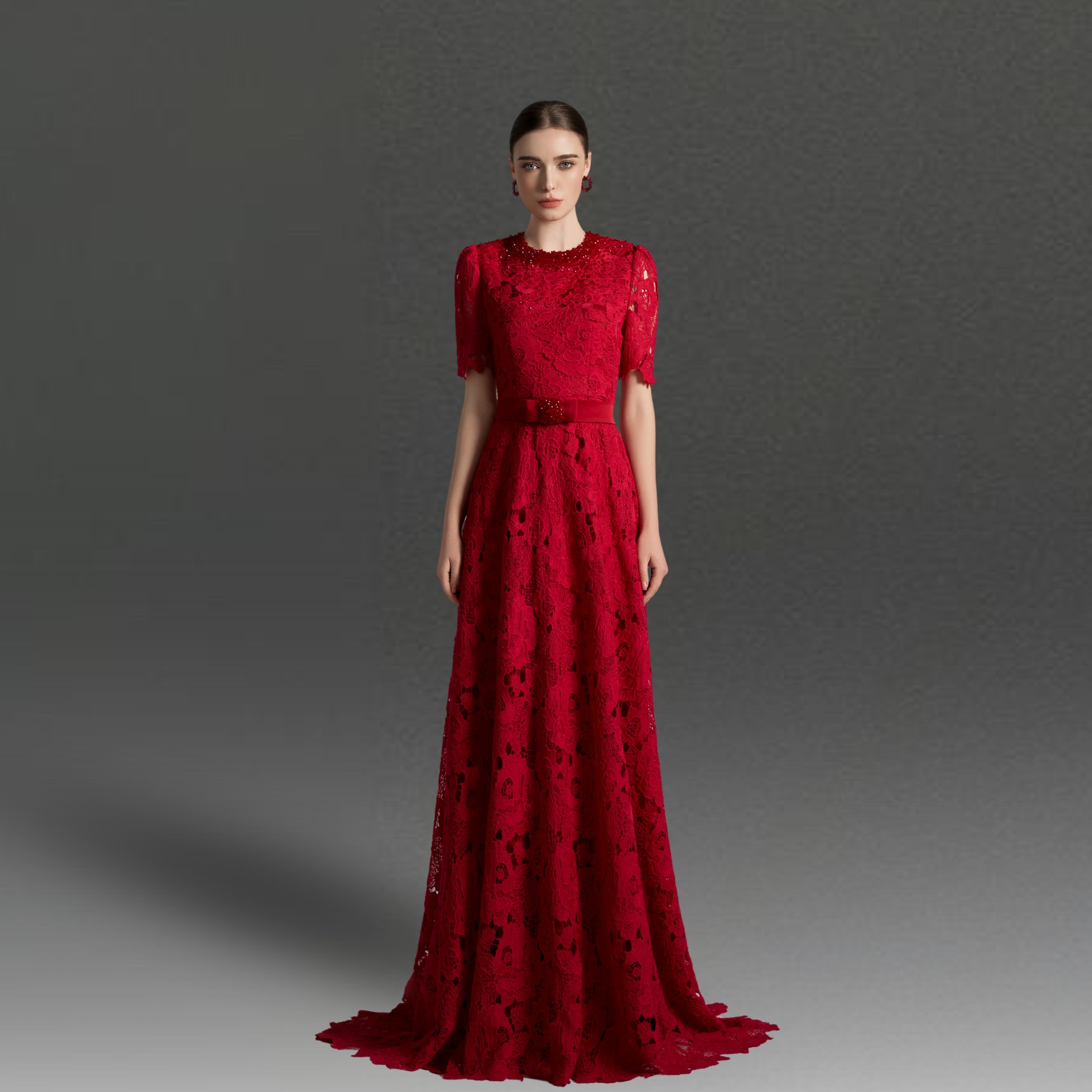 Evening Gown Collection tập trung vào phom dáng dài mềm mại, được hoàn thiện bằng chất liệu ren tinh xảo và những chi tiết đính đá thủ công tỉ mỉ nơi cổ áo, tạo điểm nhấn vừa đủ mà không làm mất đi sự cân bằng tổng thể. Từng đường cắt may được tiết chế để tôn lên chuyển động tự nhiên của trang phục, mang đến cảm giác thanh lịch và trang nhã cho những buổi tiệc trang trọng.
