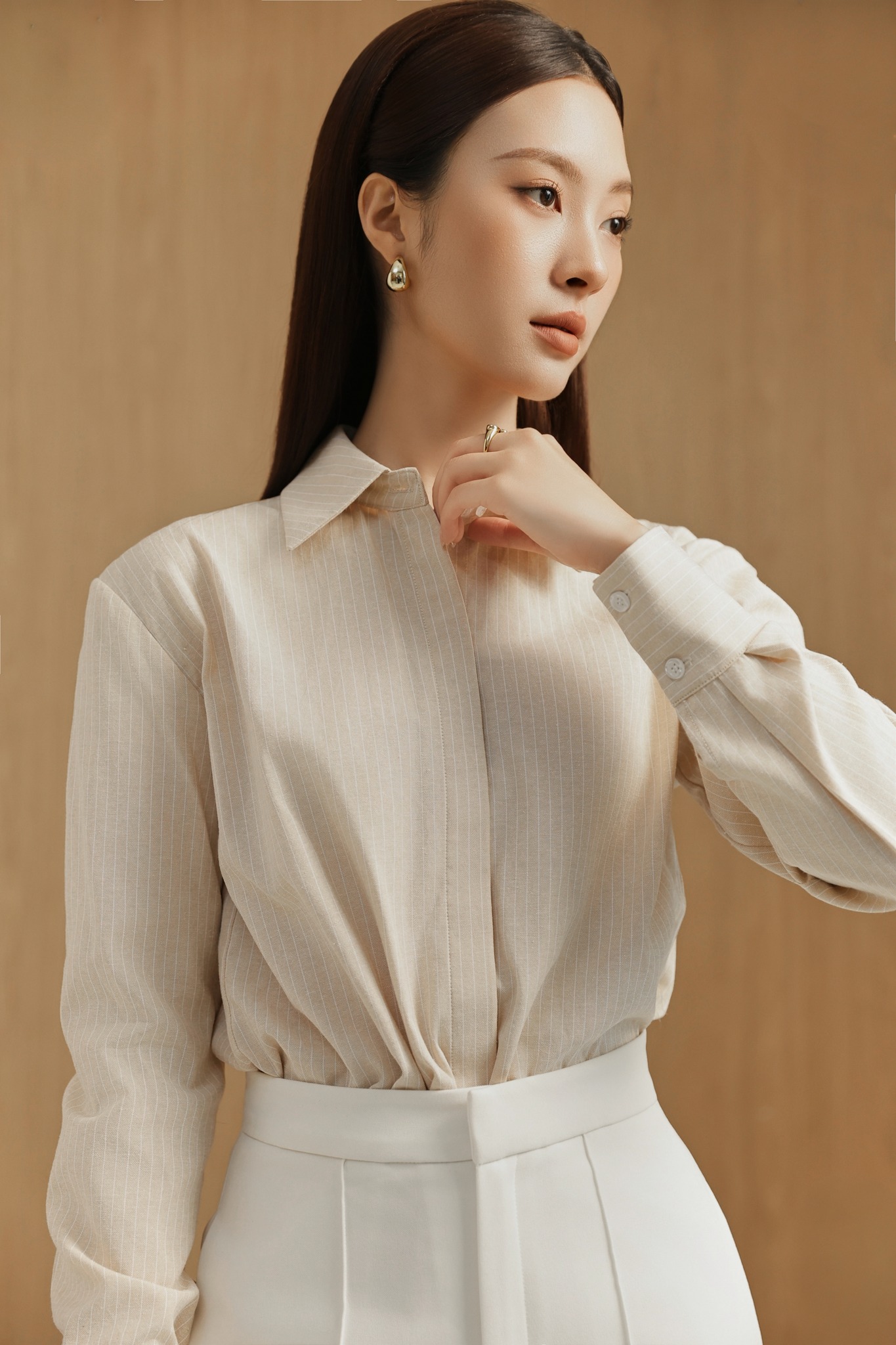 Thiết kế áo sơ mi form gọn, thiết kế tối giản với họa tiết kẻ mảnh nhẹ tạo cảm giác thanh thoát. Chất vải mềm, thoáng khí cùng tone màu kem trung tính dễ mặc, dễ phối.