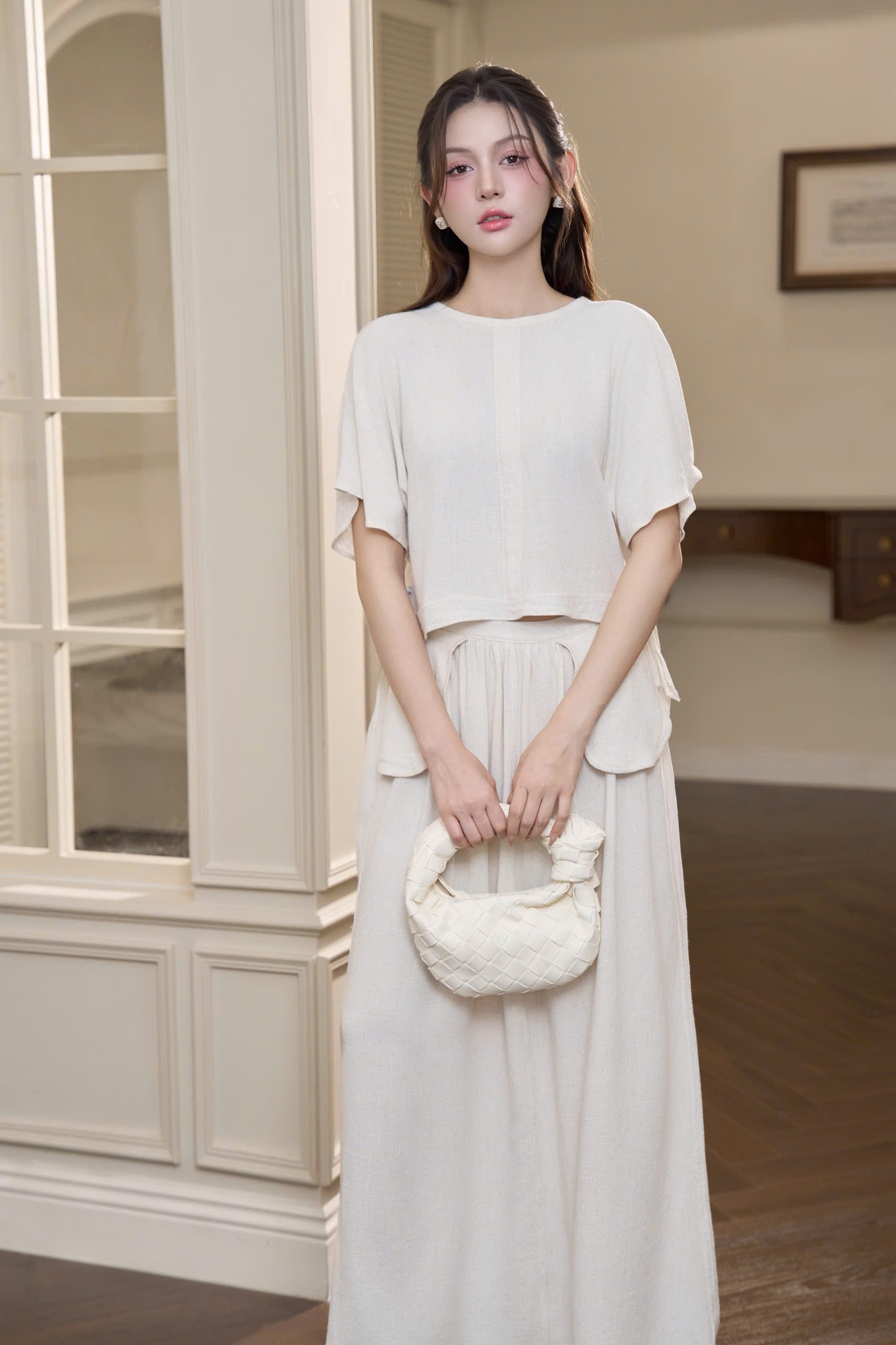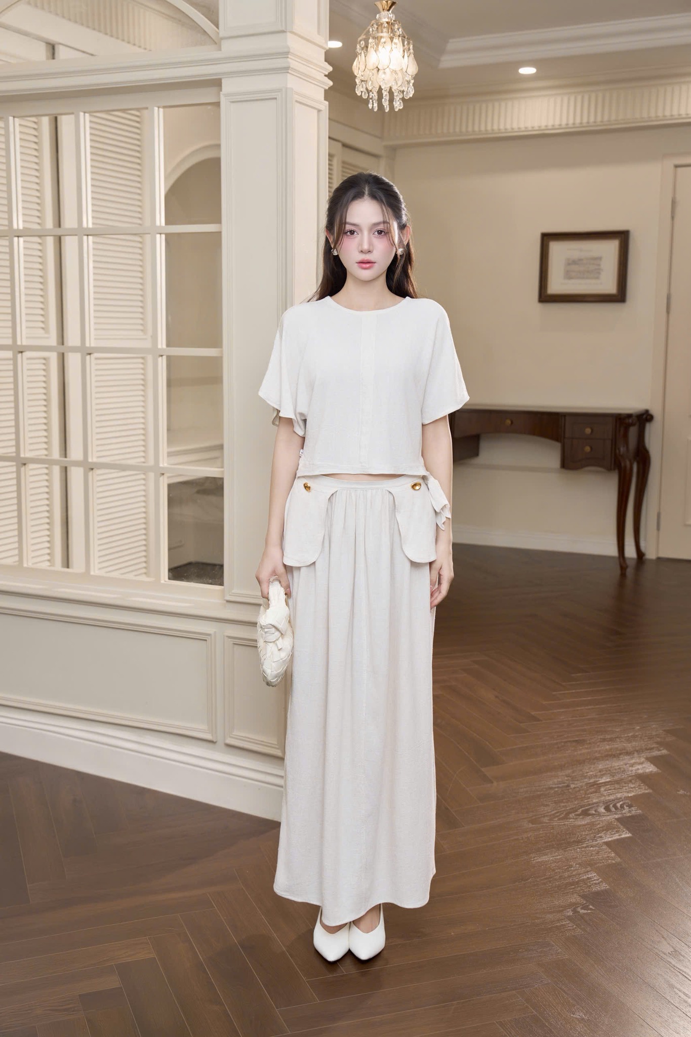 “Set Serene Linen” – mang vẻ đẹp tối giản và thanh khiết, được chế tác từ linen cao cấp sắc kem sữa dịu nhẹ. Phom dáng suông tay cánh dơi kết hợp cùng chân váy dài xếp ly mềm mại, tạo nên chuyển động uyển chuyển đầy nữ tính.