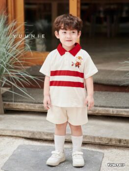 Set đồ polo phối sọc đỏ in mèo cho bé trai diện Tết đây ạ