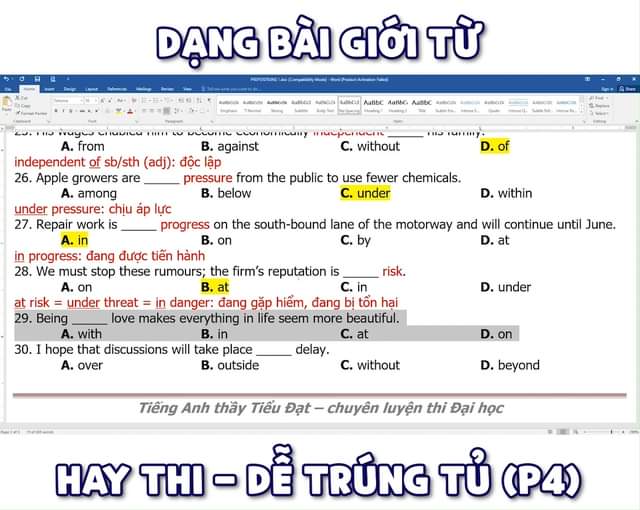 Dạng bài Giới từ Hay thi - Dễ trúng tủ (Phần 4)