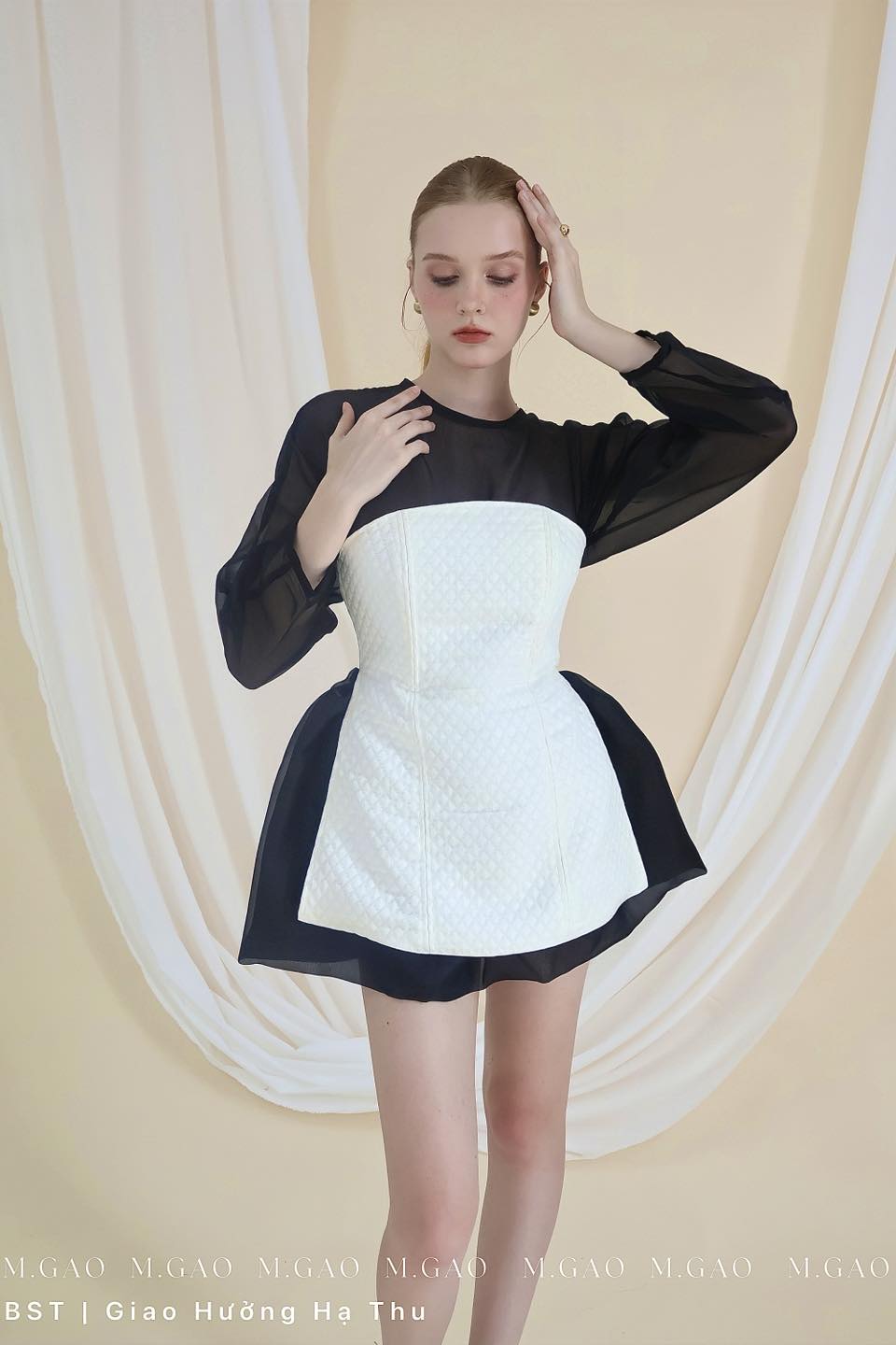 Set gồm lớp áo voan đen xuyên thấu tay dài, phối với corset trắng họa tiết ca rô chìm. ...